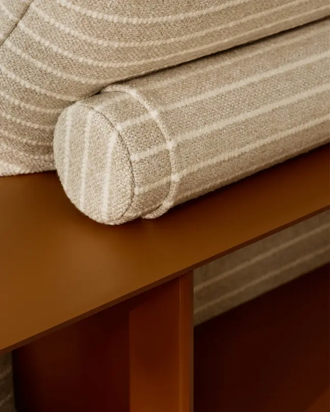 In the background, a second configuration expands the living area and underscores the seating system’s versatility. Details, such as the cowhide-clad armrest and backrest bolster cushions, reveal a signature design defined by precise choices and expert artisan craft.